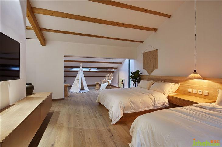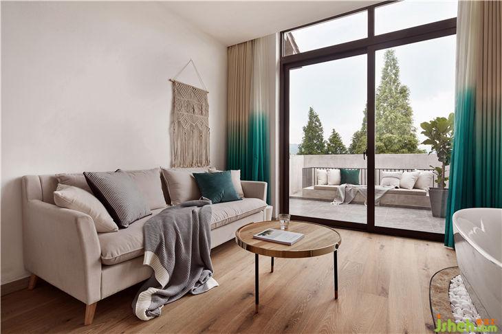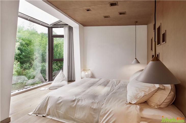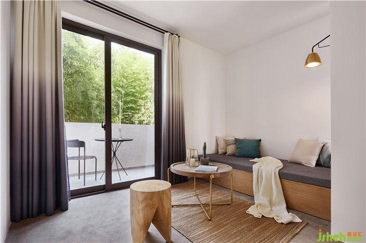 步入室內(nèi),將空間做了動靜分區(qū),一層原本的房間打通,變成了全開放共享的空間。并且做了下沉式設計,將空間聚焦于此,冬天可以感受火爐帶來的溫暖,透過拱形的大玻璃眺望遠方極致的風景,享受慵懶自在的時光。墻體與火爐的穿插式設計,提升空間趣味性。