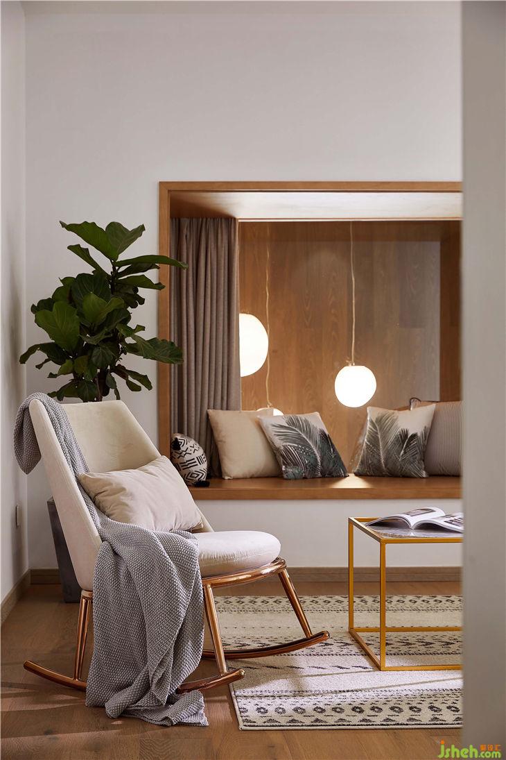 可以看到另一邊放置著木桌與坐墊,周圍植物環(huán)繞,仿佛置身于大森林中,沒有過多的裝飾,希望室內(nèi)是安靜簡單的,更多地是享受戶外的自然,營造塔莎奶奶式的被植物圍繞的自在空間。