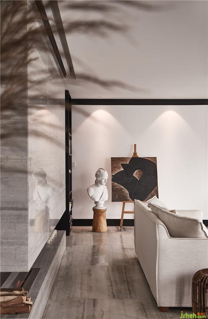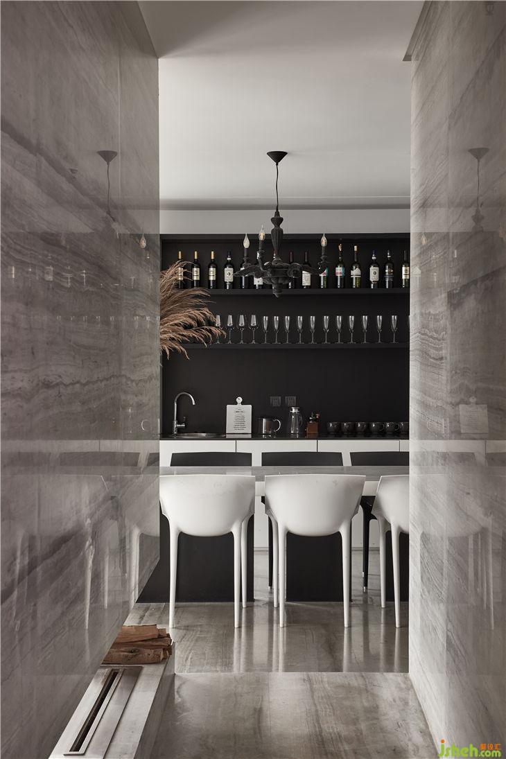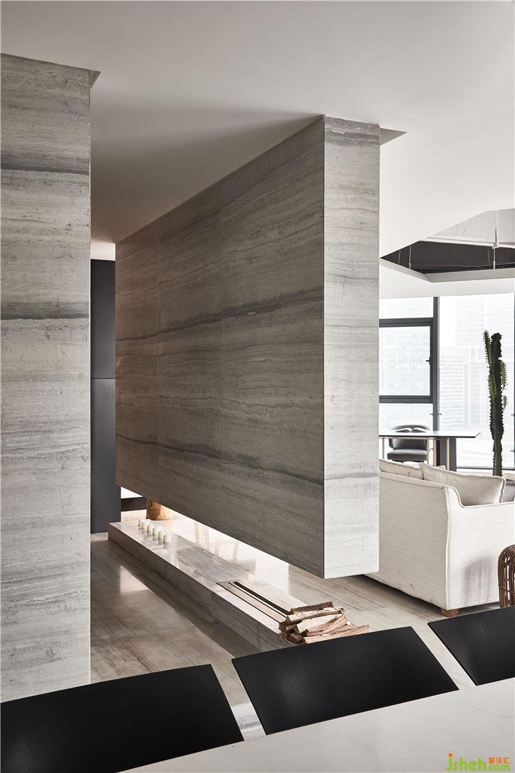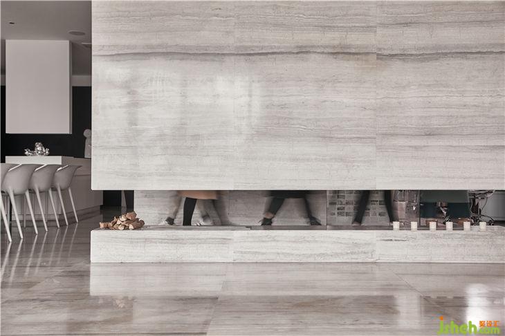 從水吧區(qū)到大廳間穿插了一個“隧道”,大理石材質(zhì)的體塊底端配以懸掛式壁爐,作為一個重要的通道連接著空間的各個區(qū)域。走在其中,虛實之間,形成豐富又連續(xù)的空間秩序。