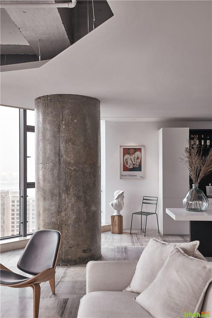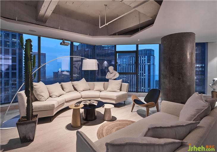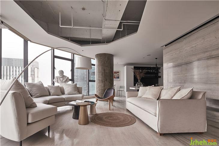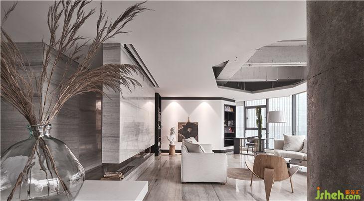 大廳中擺放著米色的麻質(zhì)沙發(fā)、木質(zhì)感的設(shè)計師椅子、金屬質(zhì)感的茶幾,暖色的射燈讓空間變得柔和且溫暖,空間節(jié)奏感變得豐富起來,增添了一絲生活氣息。
