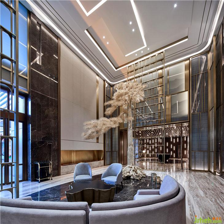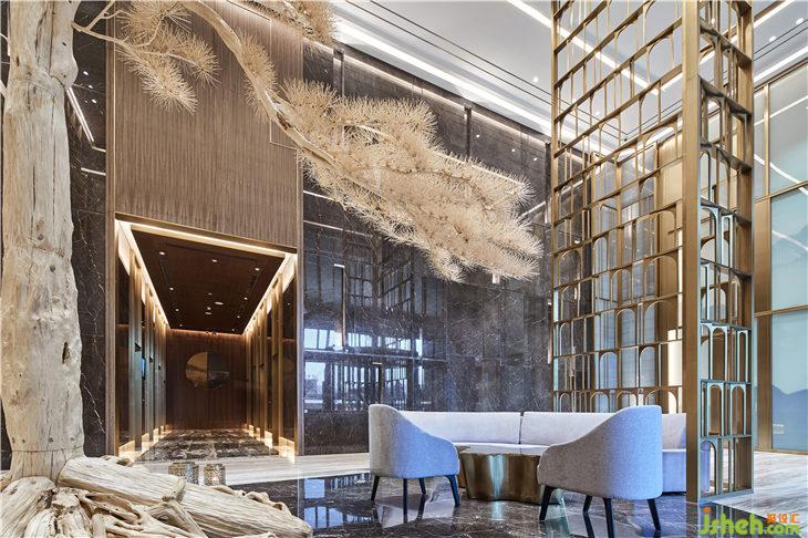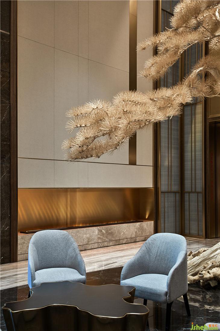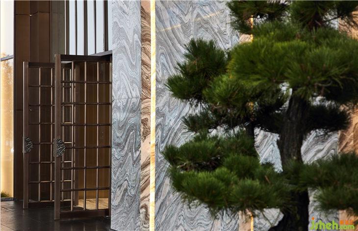 酒店大堂入口處兩側(cè)的門由傳統(tǒng)木門演變而來,地面的大理石是云朵的形態(tài),頗有“高山流水”的意境。一顆巨大松樹下是沙發(fā)休息區(qū),置身其中,有著“只在此山中,云深不知處”的閑情逸致。