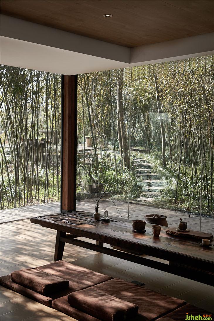 每間茶空間的設(shè)計(jì)根據(jù)不同的景觀環(huán)境量身打造,此處的茶空間被一片竹林包圍,同時(shí)又融入了一點(diǎn)當(dāng)代元素,古與今的無界對(duì)話,席地而坐,享受在竹林中暢談品茶的樂趣。