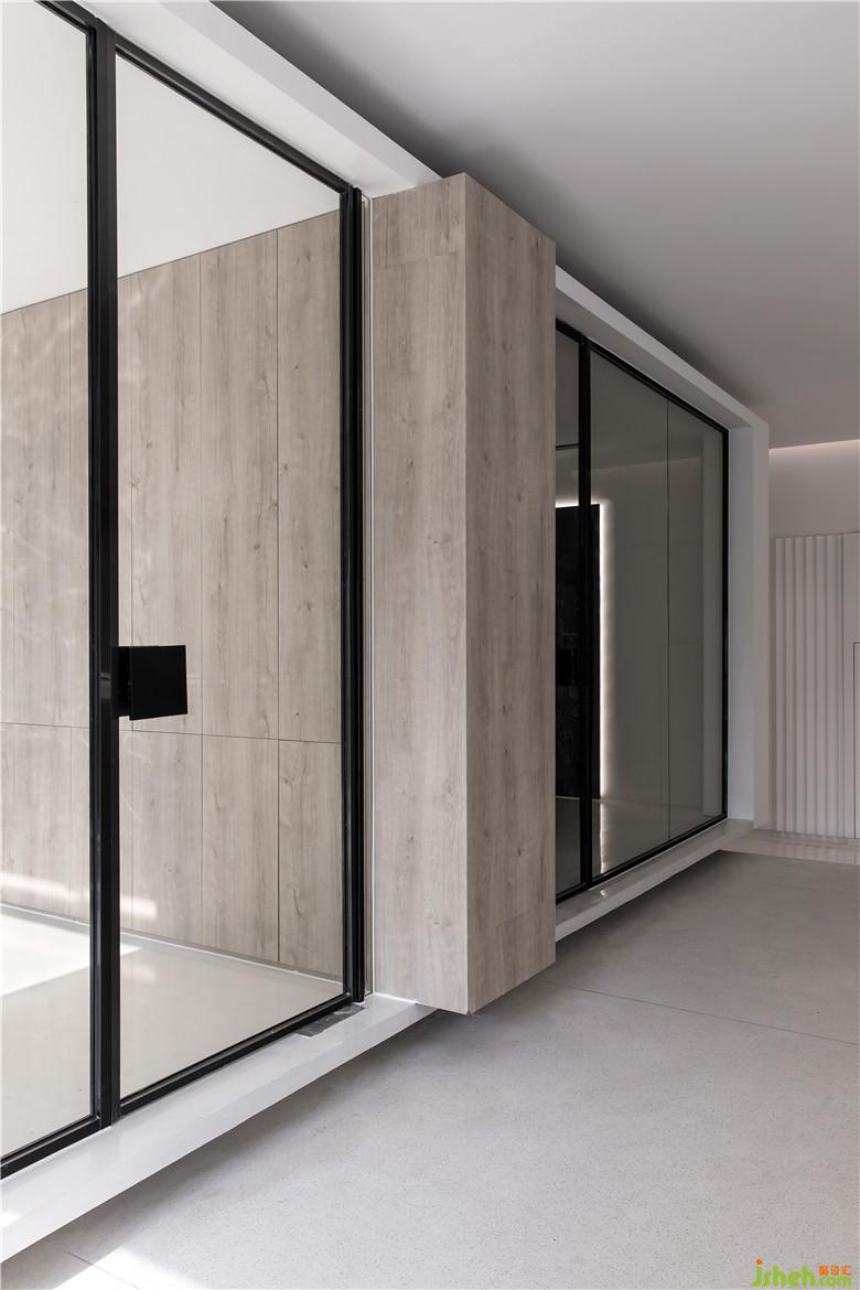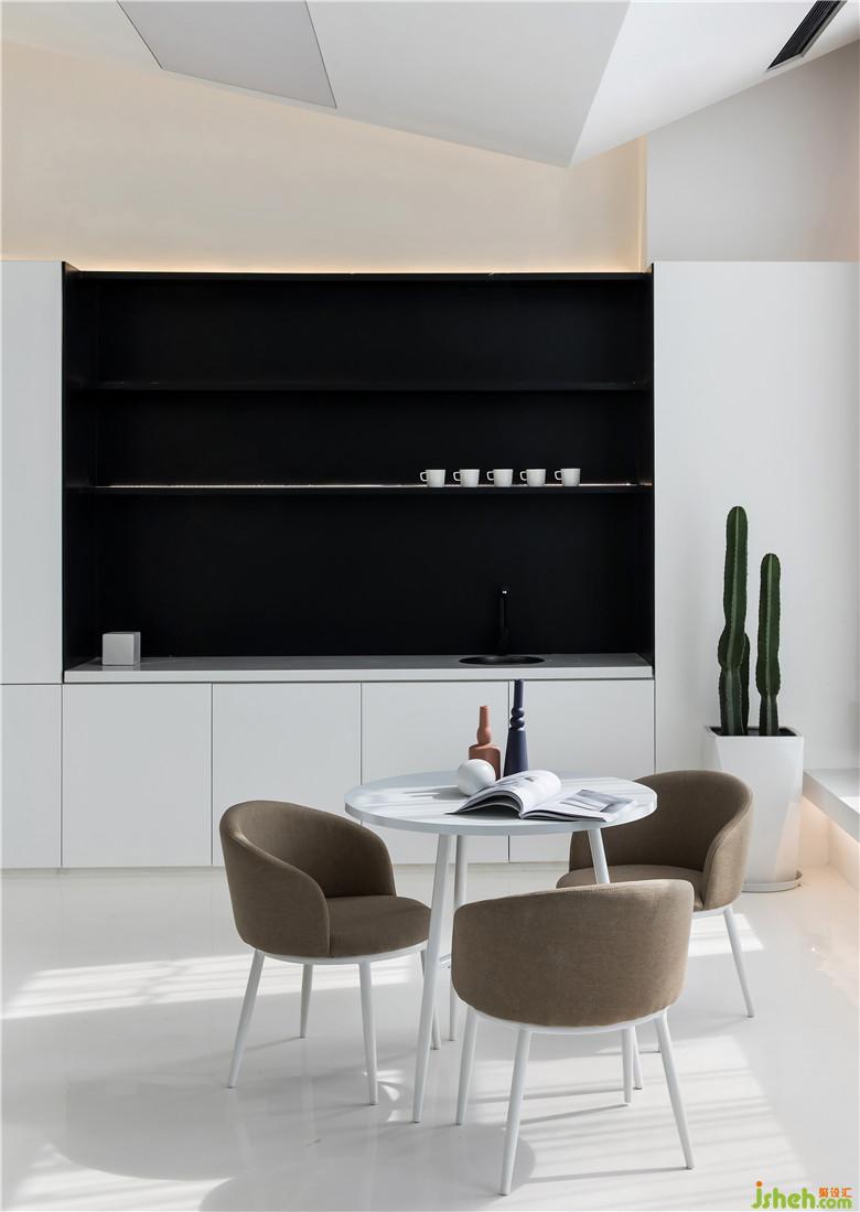 頂部的四邊形吊頂為空間增加層次感,以一根木梁貫穿其中,將墻體打通,連接了休息區(qū)與辦公區(qū)。