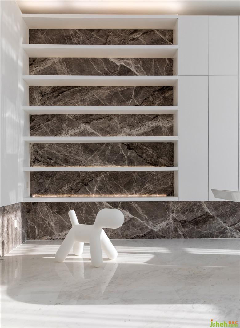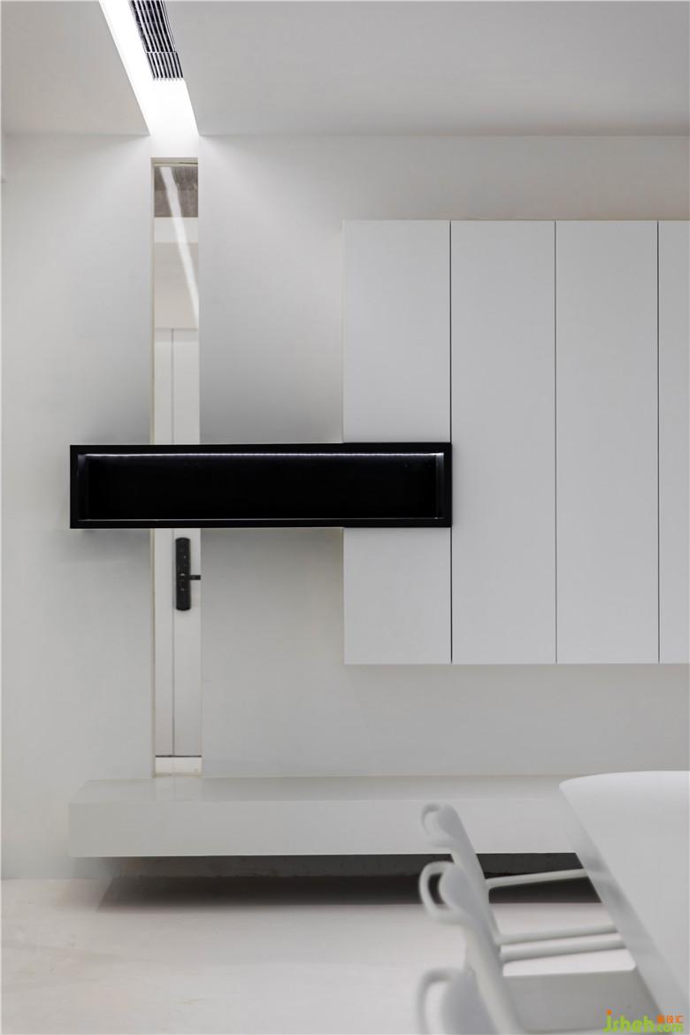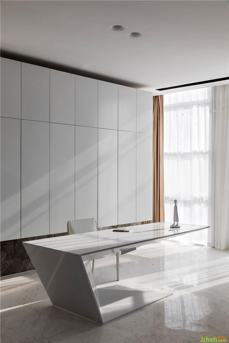 兩間辦公室也以暖色系為主,白色柜體與大理石塊面相互打通,傳達(dá)出互為共生的理念,并且滿足了文件的收納需求。