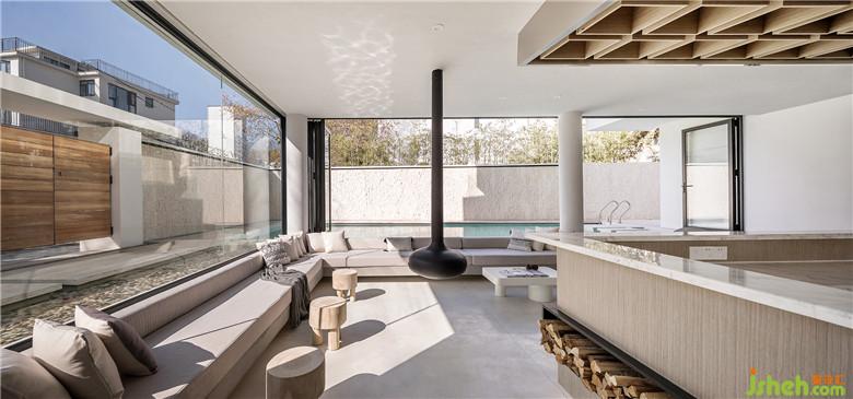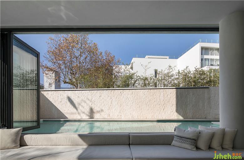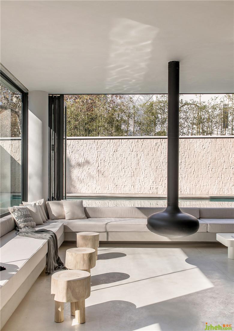 步入室內(nèi),將一層公共空間做了下沉處理,底層架空,通過柱子進行支撐讓墻體解放,猶如一根根樹干,空間瞬間變得通透、寬敞,四周大開窗的玻璃設計將景色引入室內(nèi),以景喻情,充滿了自然斑斕的色彩。