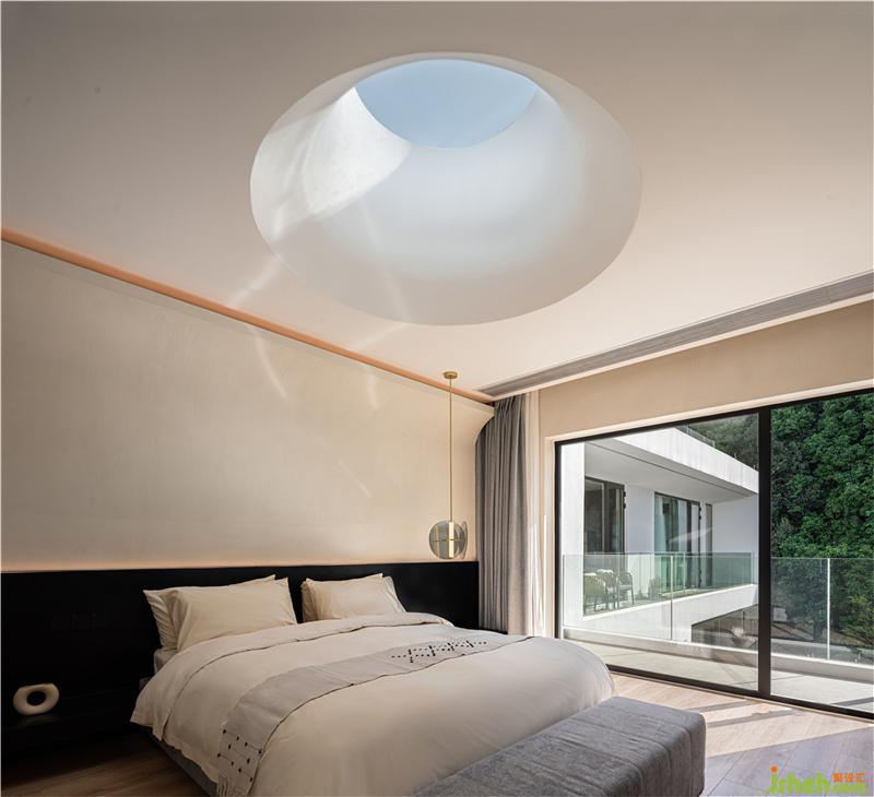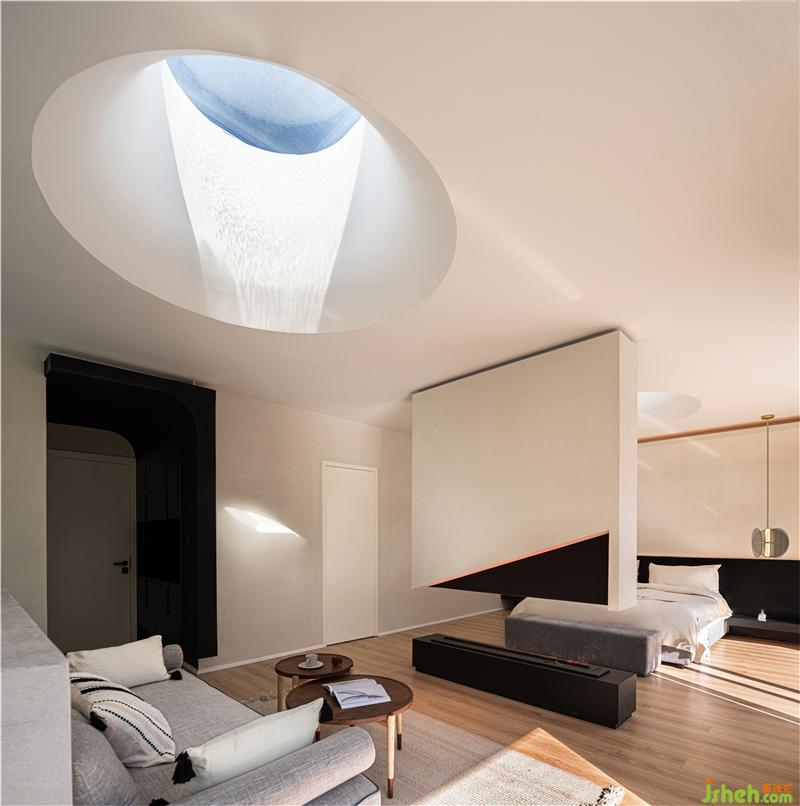 光通過(guò)開口的圓形天窗讓照入室內(nèi),光與影的交錯(cuò),仿佛與自然在對(duì)話。