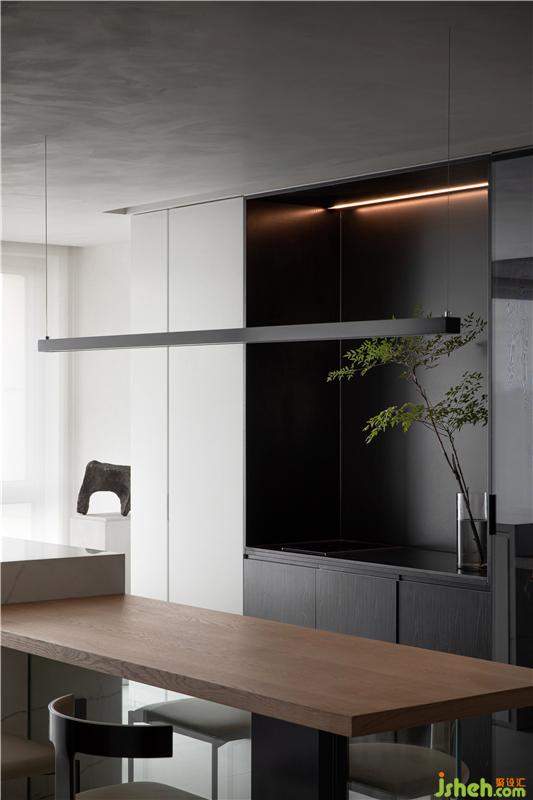 在原有格局基礎(chǔ)上,為了滿足主人不同的用餐需求,設(shè)計(jì)師劃分出一個(gè)西廚區(qū)域,灰色玻璃柜可以收藏酒品、餐具等。