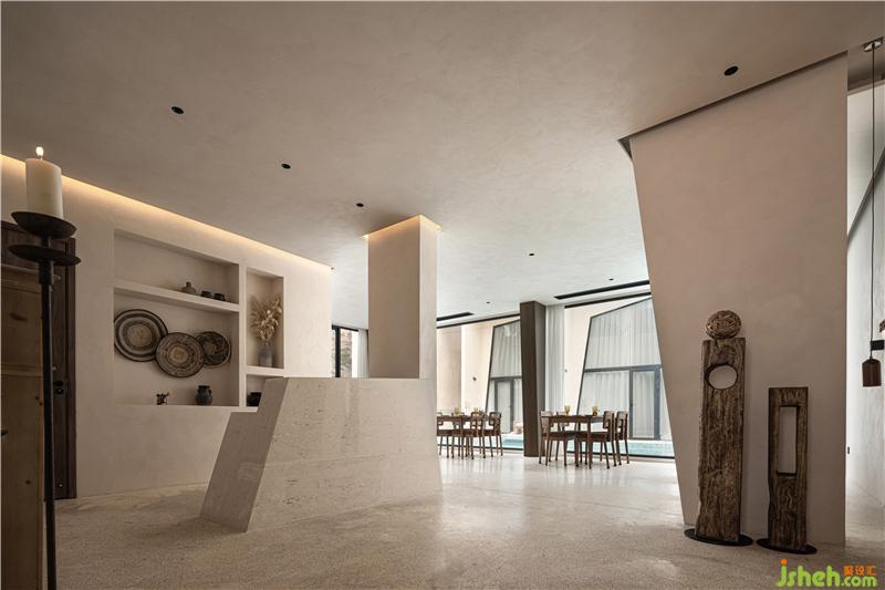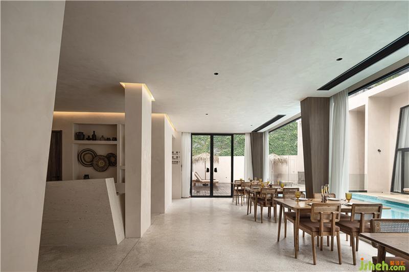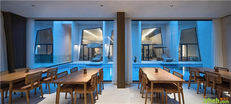 公共區(qū)域與餐廳進行結(jié)合,透過落地玻璃可以看到星空泳池的全景。