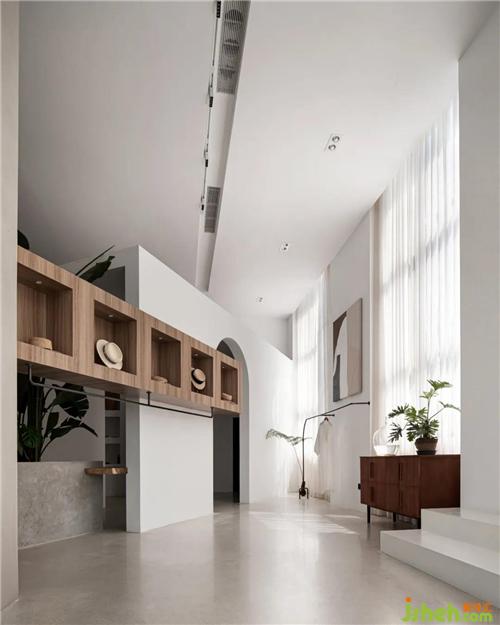 設(shè)計師在空間中鋪設(shè)層層臺階,不僅提升了造型感同時也能作為展示和休息的功能杭州店鋪設(shè)計。