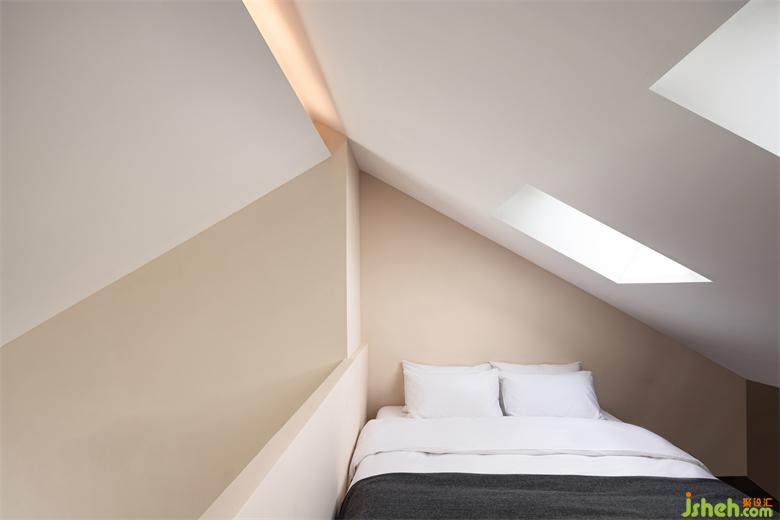 保留原本屋頂?shù)钠旅娼Y(jié)構(gòu),loft房間將空間每一處都利用到極致,燈光與空調(diào)藏入結(jié)構(gòu)中,最大化地讓空間變得極簡(jiǎn)純粹。