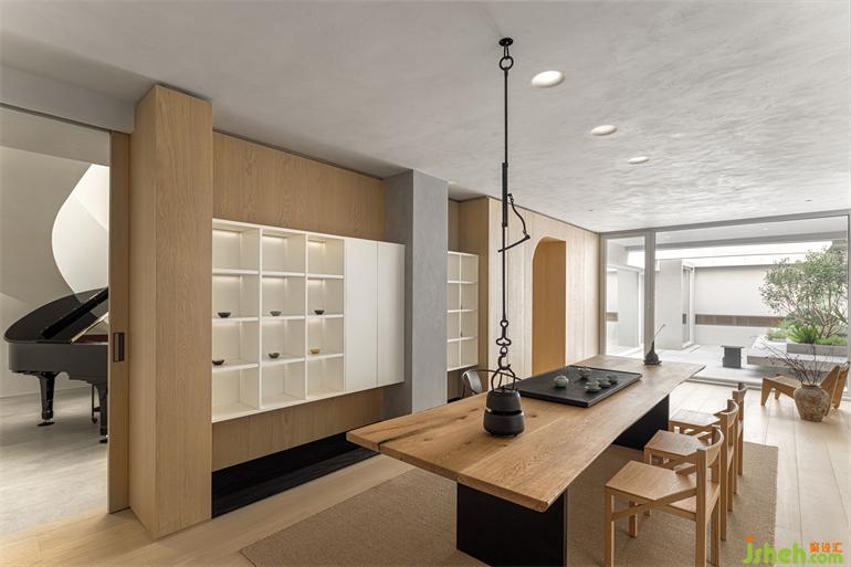 茶的禪意與哲學(xué)反映出主人的喜好與生活方式,臺州別墅設(shè)計師在茶室中保持著極簡與功能性,以木色體現(xiàn)空間氛圍,讓品茶融入生活,更是與自然產(chǎn)生對話。