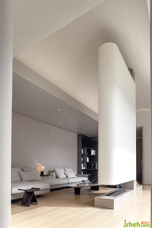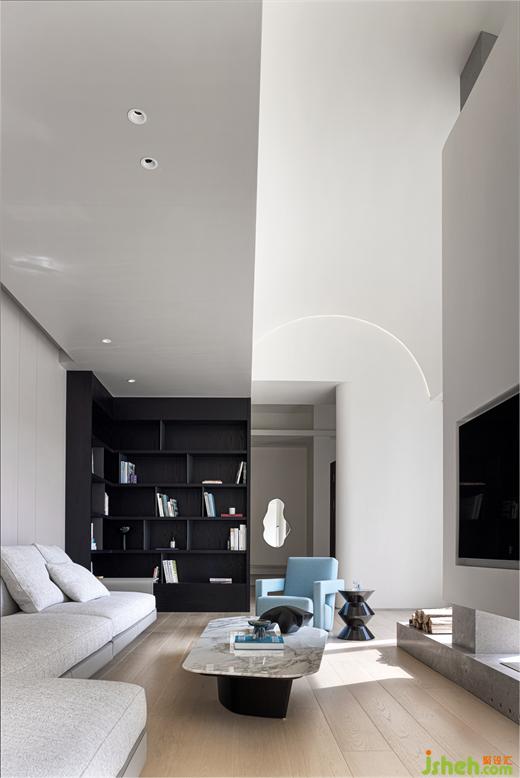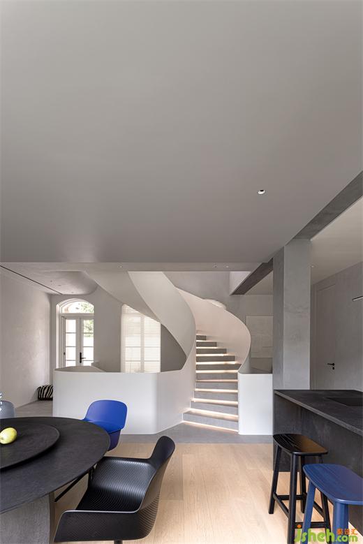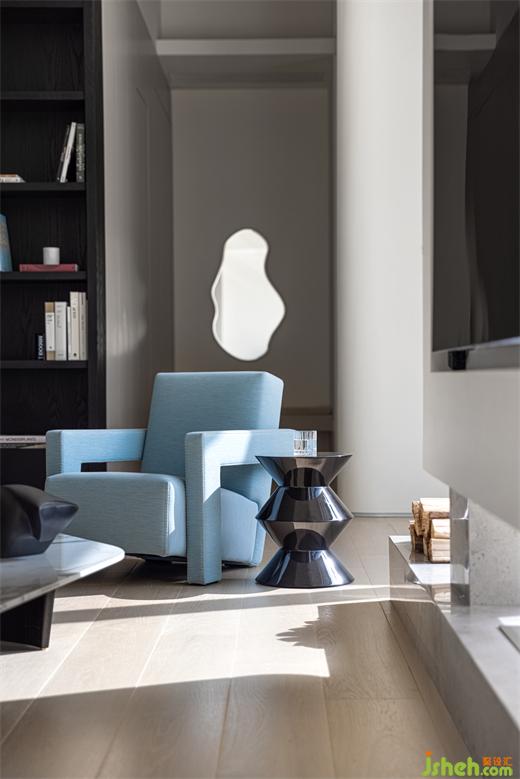 大島臺(tái)既可以作為日常的餐吧臺(tái)使用,又能滿足烹飪操作之需,柜體區(qū)域還能用作大容量收納空間?!狈健芭c”圓“形成有趣的互動(dòng),臺(tái)州別墅設(shè)計(jì)像是藝術(shù)家康定斯基在畫布上自由地發(fā)揮想象空間。