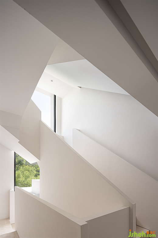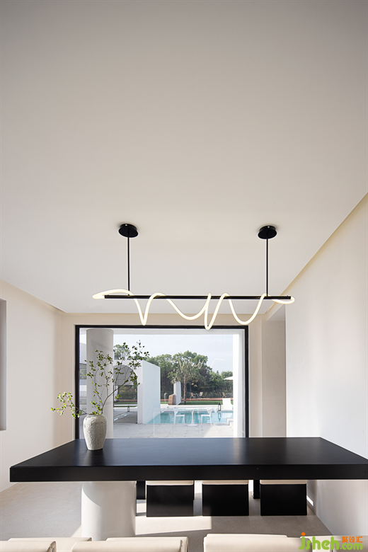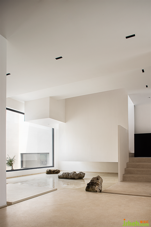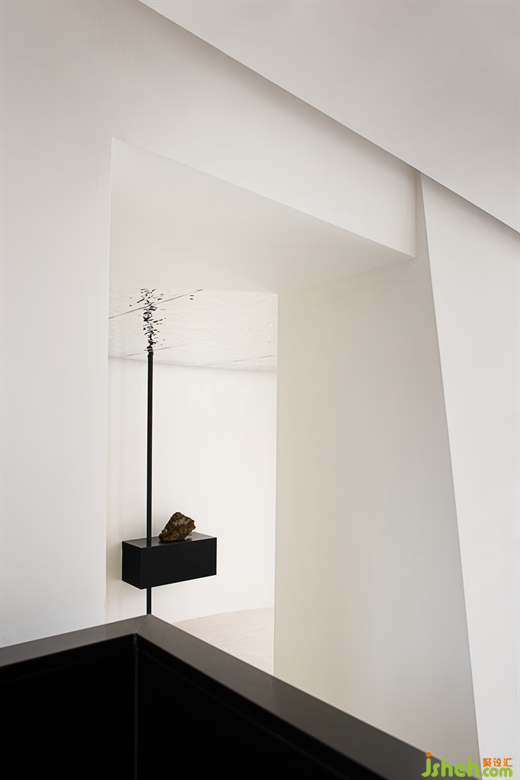 The sculptural stairway further enhances the artistry of the space, placing taihu Stone and lake water into the space to form a miniature landscape, as if in the beautiful scenery.