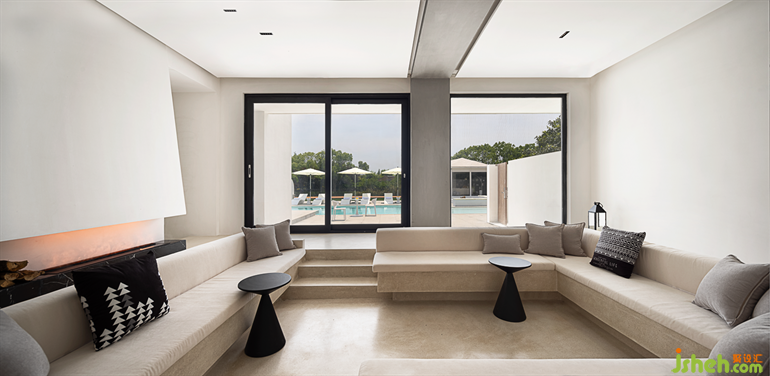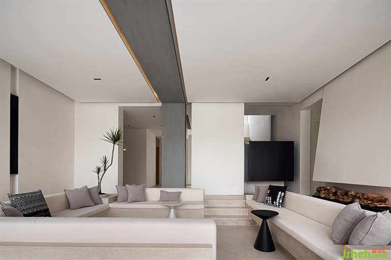The sunken booth in the living room is combined with the fireplace to feel the minimalist beauty of the space in a proportionally balanced construction. The staircase leading to the second floor is expanded into a square black volume, which is quite poetic to stand on the deck and overlook the island scenery.