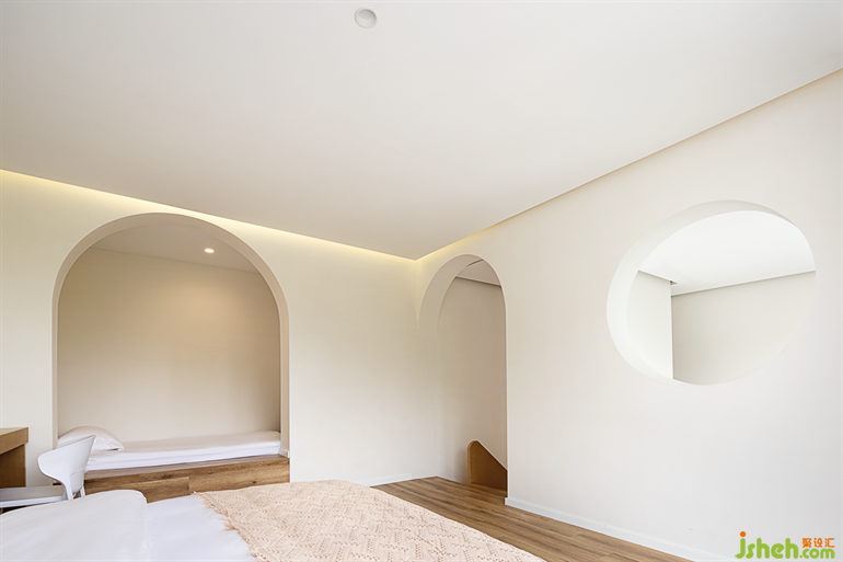 不同于常規(guī)方正的門框造型,弧形的洞穴元素與空間自然連接,蘇州民宿設(shè)計(jì)空間變得更加隨意與自由,感受洞穴探險(xiǎn)的樂趣。