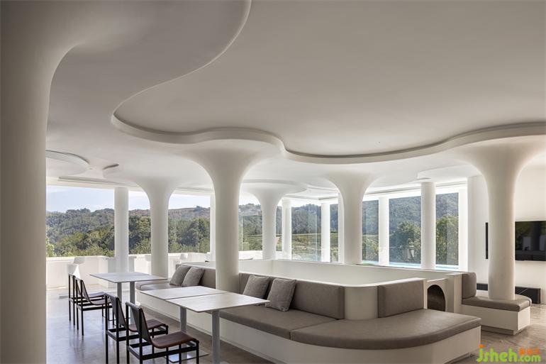 環(huán)繞式的休息區(qū)周圍分布著與頂部連接的立柱,弧形結(jié)構(gòu)包裹出造型頂面,猶如進(jìn)入了一片森林。透過(guò)落地玻璃可以望向室外郁郁蔥蔥的風(fēng)景,模糊了室內(nèi)與市外的邊界。