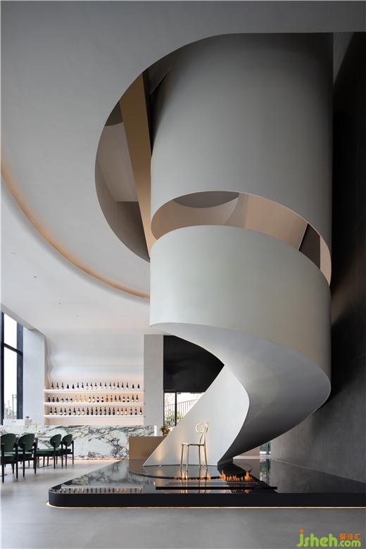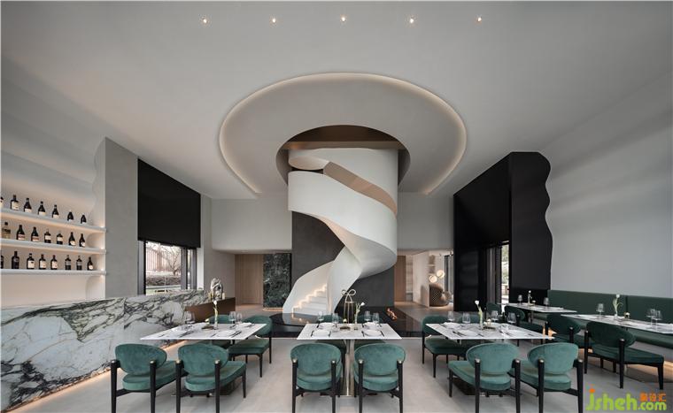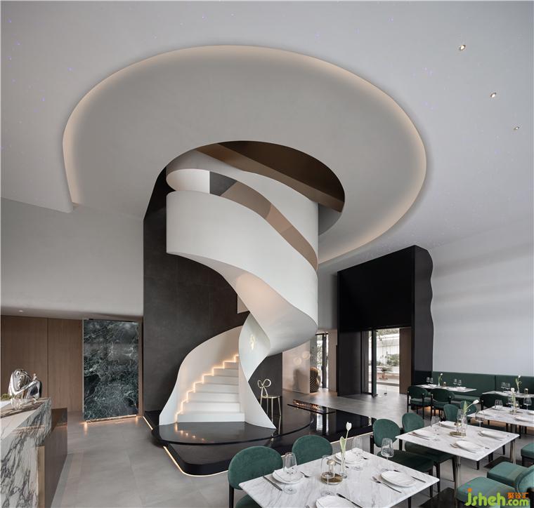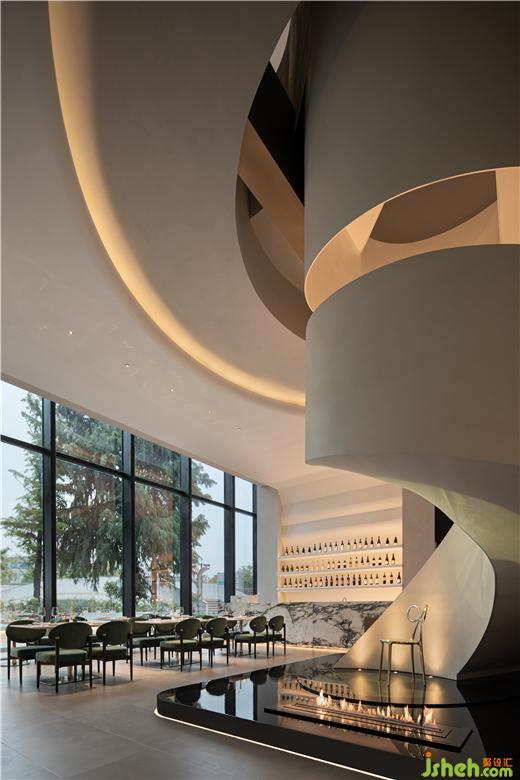 臨江而坐,綠林環(huán)繞,悅+ Deco 生活美學(xué)館設(shè)計(jì)外部花園餐廳被褶皺的飄帶造型卡座圍繞,