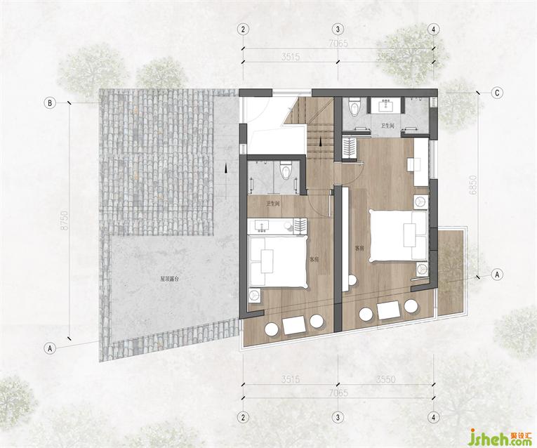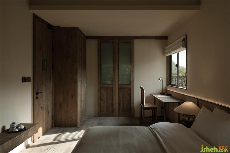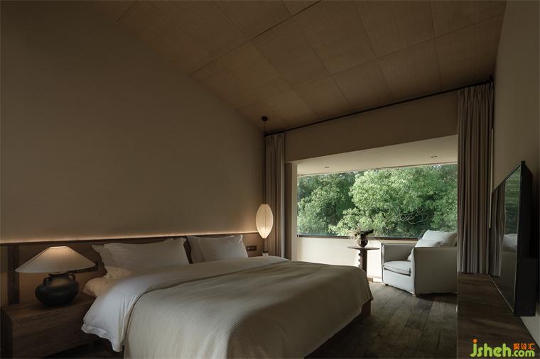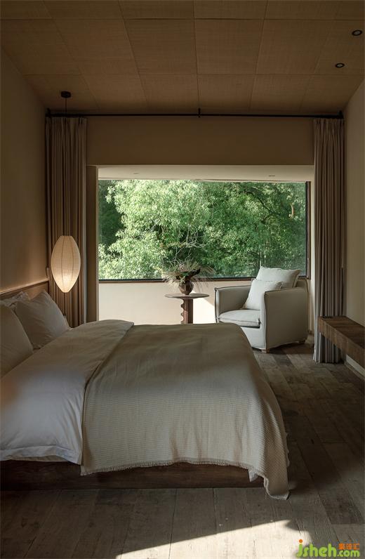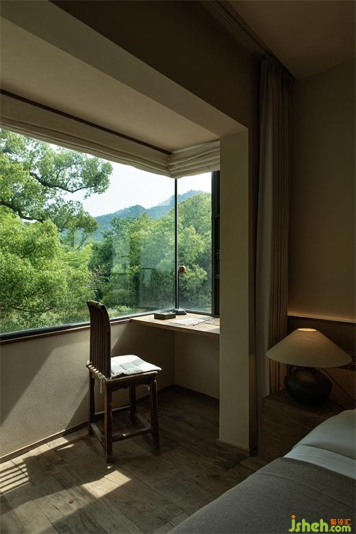 推開客房的門,不刻意對空間進行修飾,讓窗外的景象成為空間中的一部分,綠意滋養(yǎng)著身心,仿佛睡在自然中。