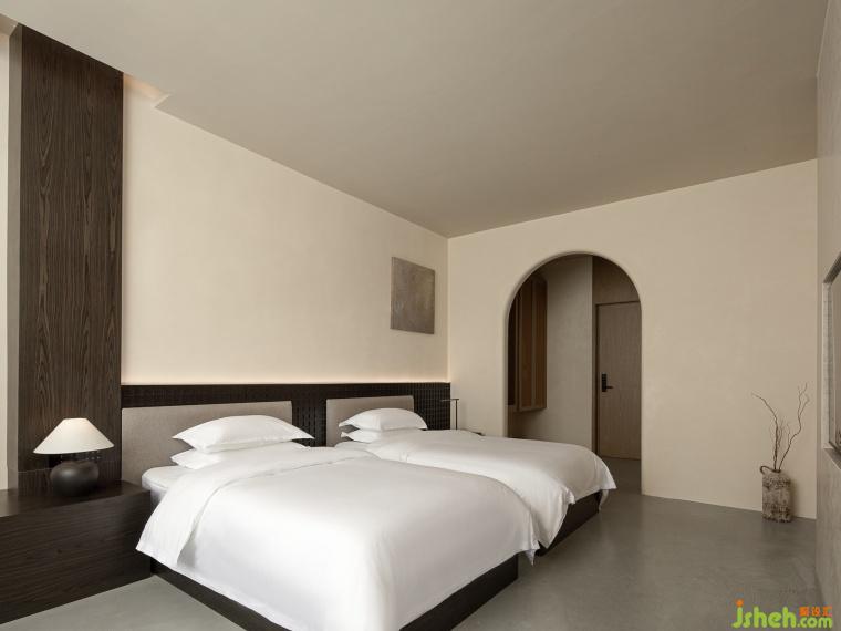 民宿設(shè)計通過戶外的廊架將三座建筑聯(lián)系?起,通過陣列?度象征性的視覺藝術(shù)形成夢幻場景。Connect the three buildings together through outdoor pergolas and create a dreamlike scene through highly symbolic visual art arrays.