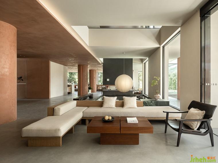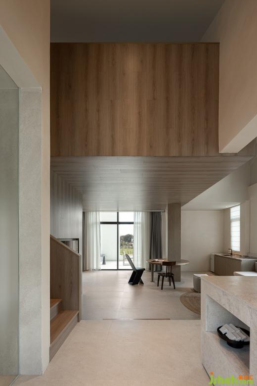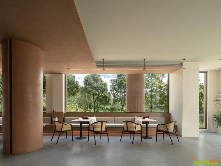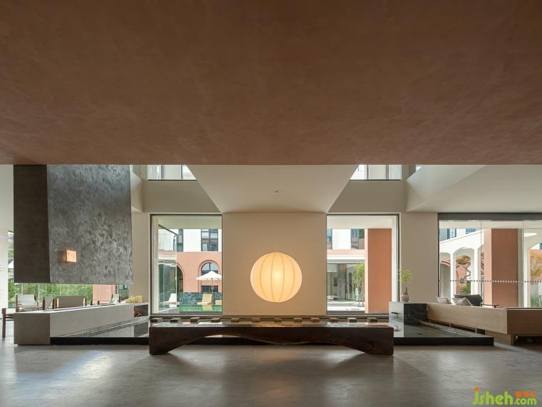 Through the corridor, surrounding the central swimming pool, the first floor area of the three buildings is open and elevated, providing more communication space for guests.