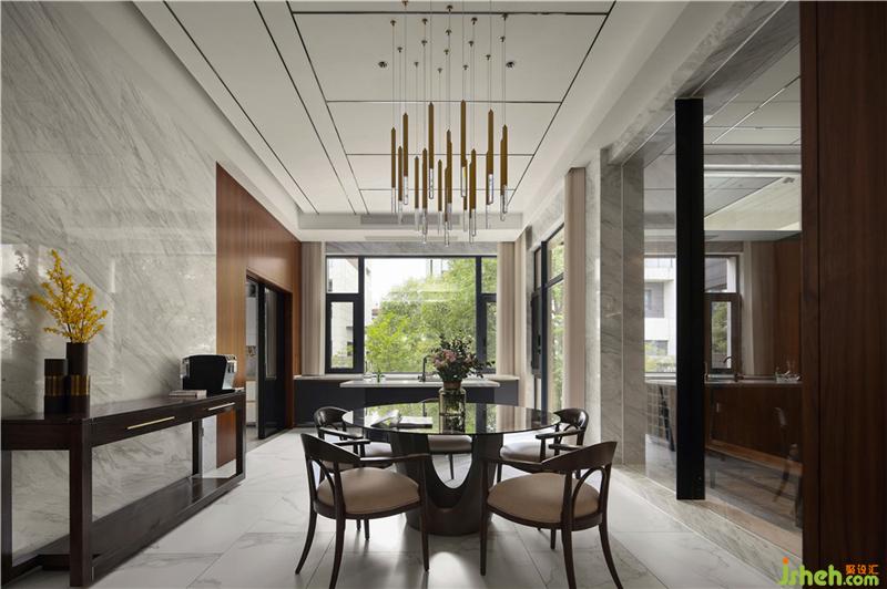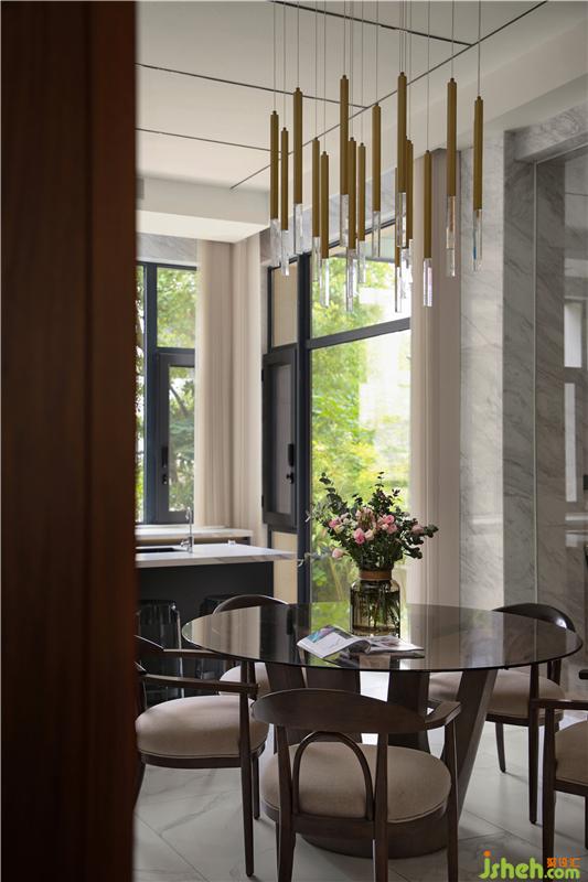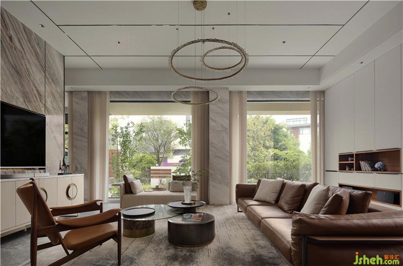 我們將花園面積外擴到了整體面積里,使得空間面積變大,在入門口設立了門廳增加了內(nèi)外的空間過渡感。將廚房分成了中西廚房 既豐富了廚房的功能 同時西廚的部分又成為了餐廳空間的延續(xù) 使餐區(qū)空間得到視覺上的擴大,舒適度得到了提升??蛷d、茶室之間添加一面裝飾墻,使彼此空間感更加明確。通過調(diào)整,將一、二層的空間更加合理化。整體色調(diào)采用棕白黑為主色調(diào),加以綠植的點綴,帶來舒適特有的溫度感。整體材質采用石質木質為主,白色大理石的堅硬和木質墻面的質樸,再融合皮質特有的柔軟,凸顯出設計質感所在。