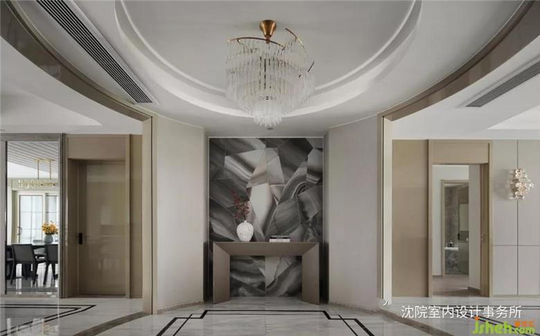 圓形的吊頂和圓形水晶金屬的旋轉(zhuǎn)吊燈的設(shè)計(jì),更加凸顯了門廳在整體空間中的重要性地位,也使整體空間更具層次感。