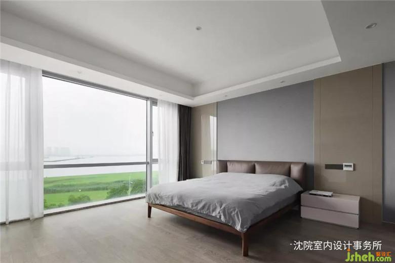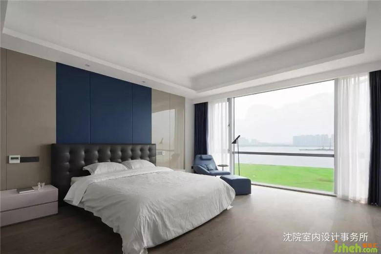 整面落地窗的設(shè)計(jì)使整體更加具有空間感,藍(lán)色背景墻與藍(lán)色沙發(fā)椅搭配空間,與窗外的湖景相互輝映。