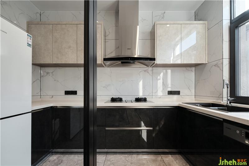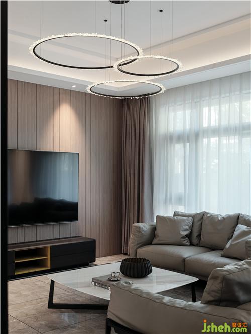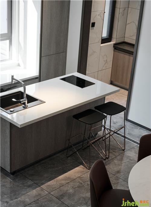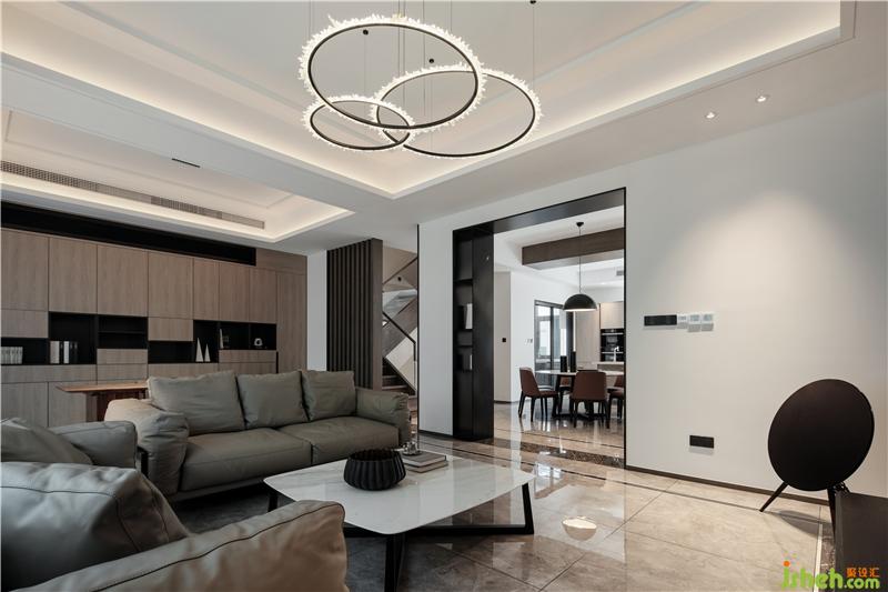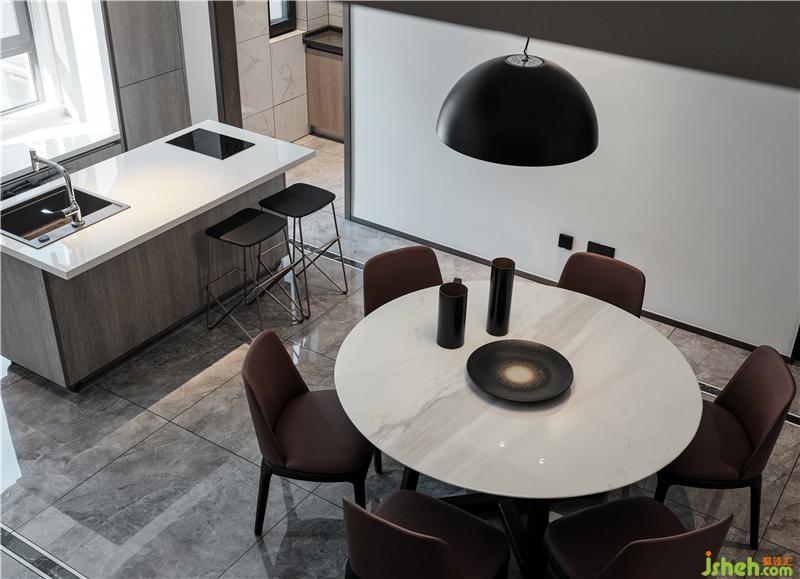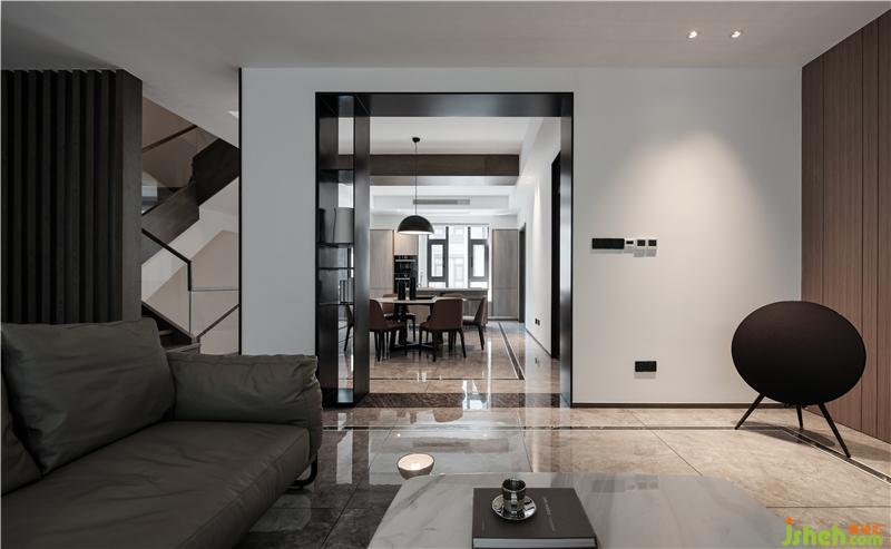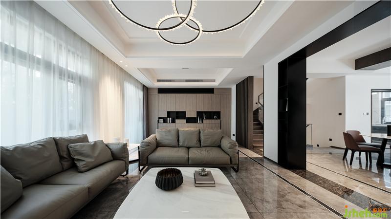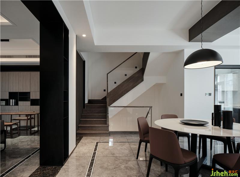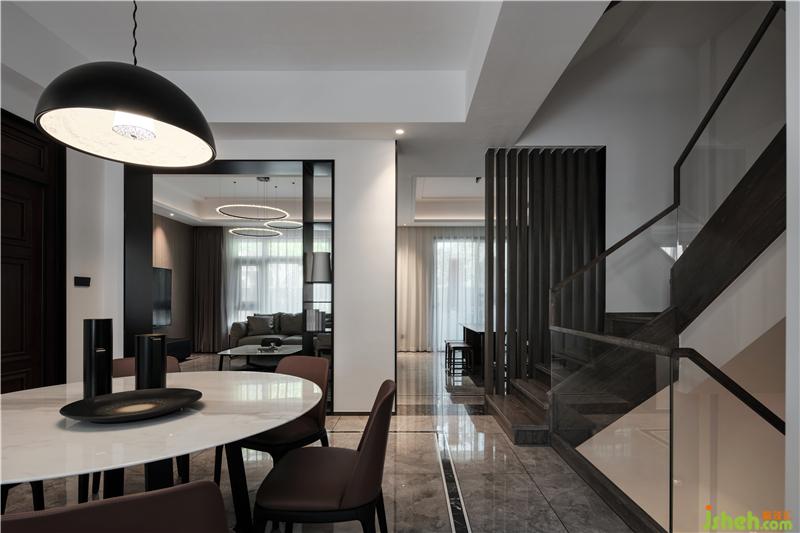 整體色調以白色為主,佐以黑色和原木色為點綴。大面積粉刷白色乳膠漆,黑色金屬門套和踢腳線強調現代主題,黑與白的碰撞與交織,加上自然的原木色作為調和,給人安靜、舒適和沉穩(wěn)的視覺享受。蘇州別墅裝飾餐廳上方矮梁用深色木飾面做寬作為餐廳與西廚區(qū)的分隔,樓梯側墻去半,改用木質格柵增加客餐廳之間的聯(lián)系和線條感,虛實結合、錯落有致,進而增加了通透性和層次感。