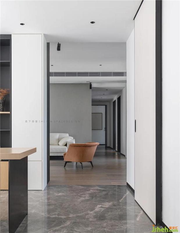 金屬的光暈,石材的細微變化,一同喚起居住者的感官體驗。不同層次的灰色相互搭配,營造出開敞低調(diào)舒適的氛圍,表面上看不到多余的物品,實則都藏在設(shè)計之中。