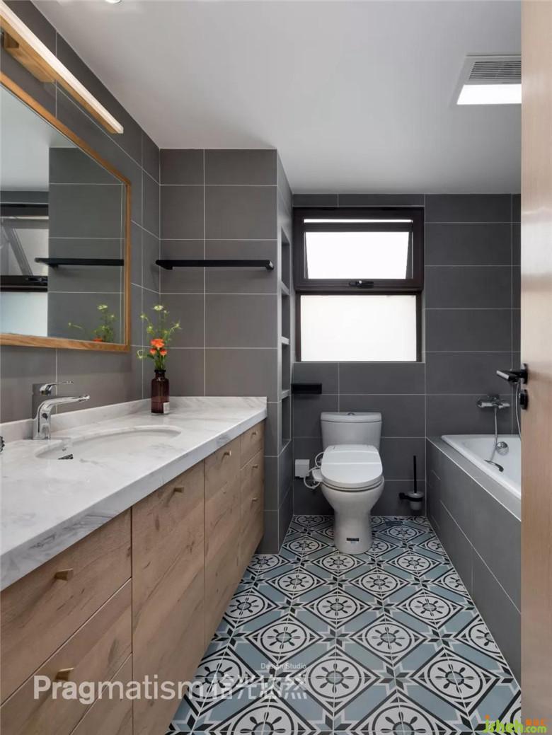 通過空間改造做出浴缸區(qū)域,地面拼接花磚讓簡(jiǎn)約的浴室不簡(jiǎn)單。裝修公司