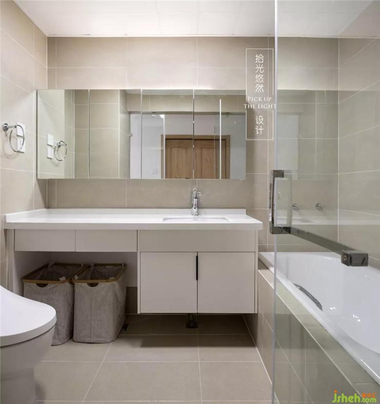 主衛(wèi)做了鏡柜可以把收納藏起來(lái),而且玻璃質(zhì)感能提升空間通透性,洗面臺(tái)下特意留有收納空間可以放臟衣籃