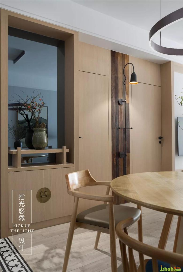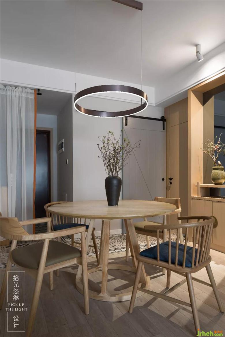 平時就兩個人就餐,圓桌的設計讓動線更柔和與靈動,因為臥室門與衛(wèi)生門都在一個平面上,所以整體采用現(xiàn)場制作隱形門的方式,廚房門采用谷倉門的設計