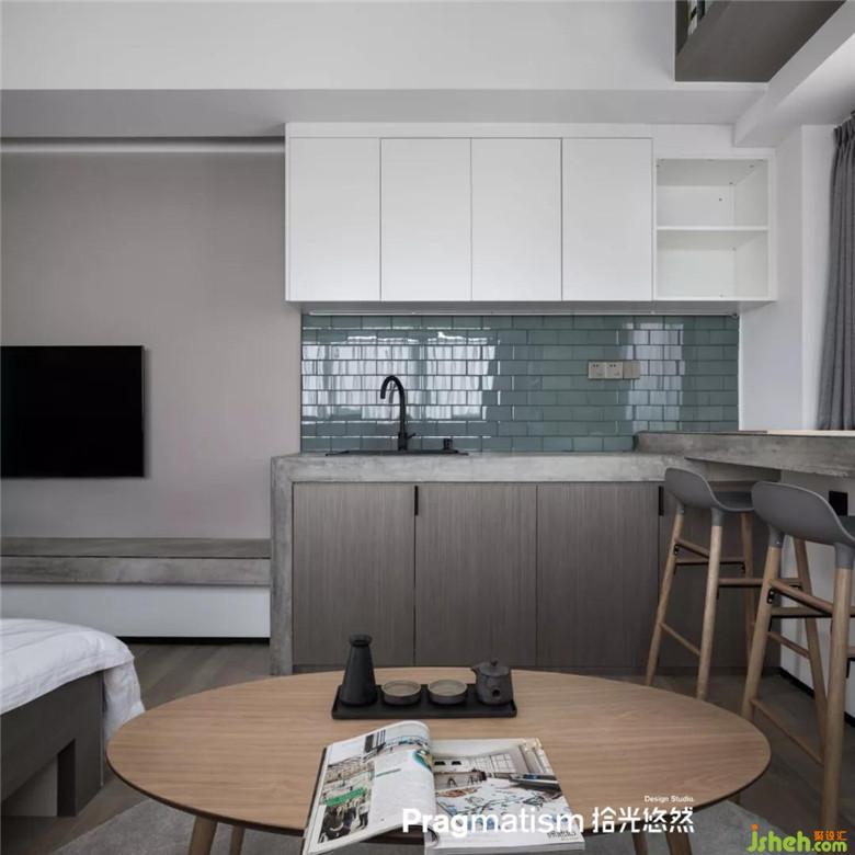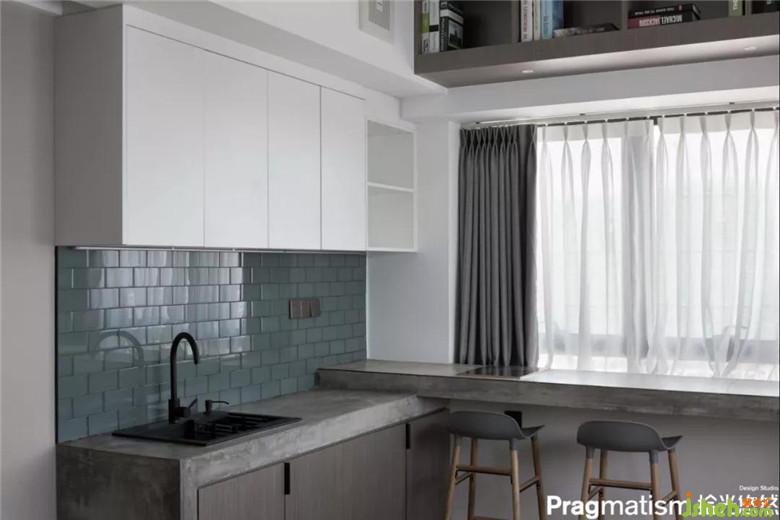 櫥柜里有嵌入式冰箱,餓了的時(shí)候可以用電磁爐做輕烹飪,煮面條下餃子或者蔬菜沙拉,可以坐在吧臺上就餐,走神,天馬行空。