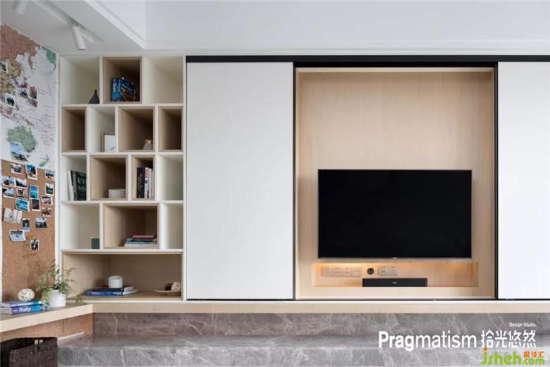 電視墻是整個(gè)拉通的造型,底部沒有任何支點(diǎn)。需要把電視墻的背后加固得足夠牢靠,石材+木工板的處理方式增加了區(qū)域?qū)哟涡浴铱展衽c燈帶的配合能帶來一些些夢(mèng)幻感,簡(jiǎn)潔的小茶幾輕便耐看。