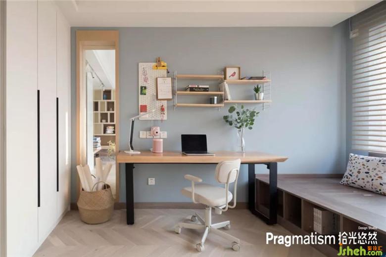 書房功能也很強(qiáng)大,頂天的收納柜、足夠長的書桌和寬敞的榻榻米,還有一個好看的穿衣鏡。