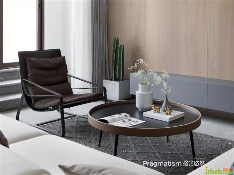 客廳采用的是木飾面與水泥板打造低調(diào)慵懶的氛圍,電視櫃定制懸掛,更現(xiàn)代極簡。