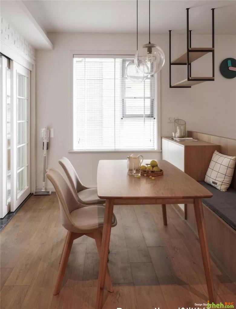 簡約的木質(zhì)餐桌,邊角的弧度抹去常見尖角的鋒利感,卡座設(shè)計(jì)也不用擔(dān)心偶爾來客人時(shí)座位不夠的局限性,卡座邊柜作為餐廳的日常收納角落是重點(diǎn)且不可忽略的存在。