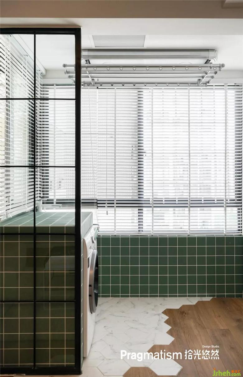 綠色小方磚鋪設(shè)生活陽臺,讓空間區(qū)域劃分更明確更突出。現(xiàn)場泥作的洗衣機(jī)框架,讓洗衣機(jī)嵌入框架內(nèi),整潔又美觀。