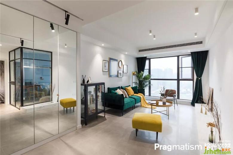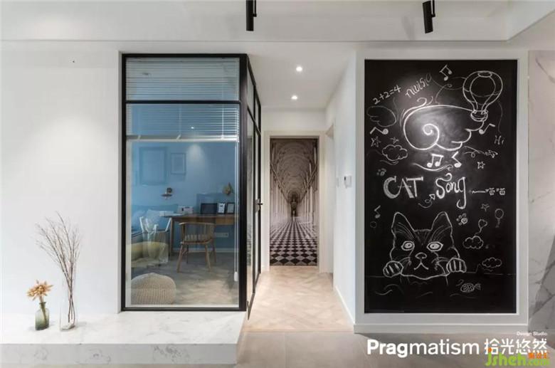在設(shè)計多功能房時,將轉(zhuǎn)角的墻面全部設(shè)計成玻璃墻體。一方面來的客人有對貓毛過敏的話就可以做一間隔離室;二是當(dāng)貓咪們獨自在客廳玩耍時不會因為找不到主人而感到孤獨焦慮。