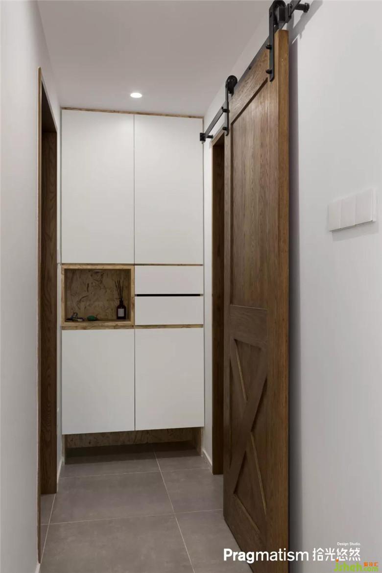 我們現(xiàn)場木作了歐松板的鞋柜,鞋柜下方留出了空間,用于臨時(shí)存放每日換下的鞋子。