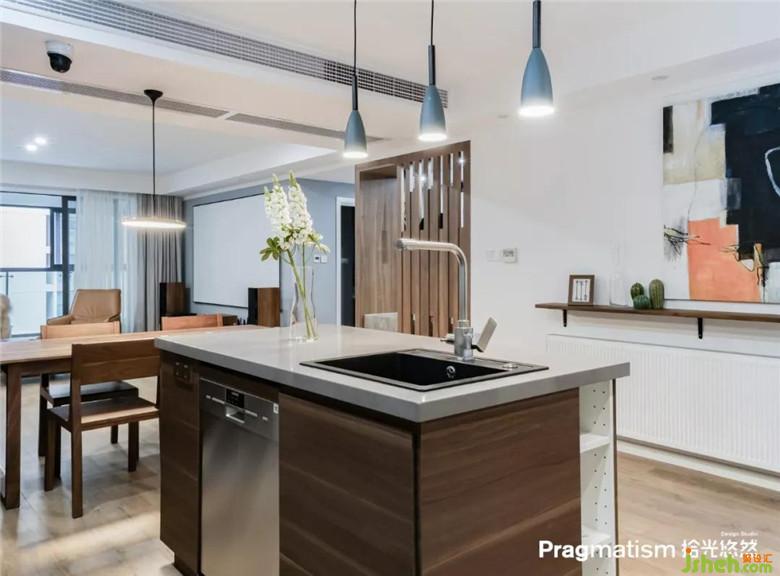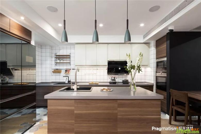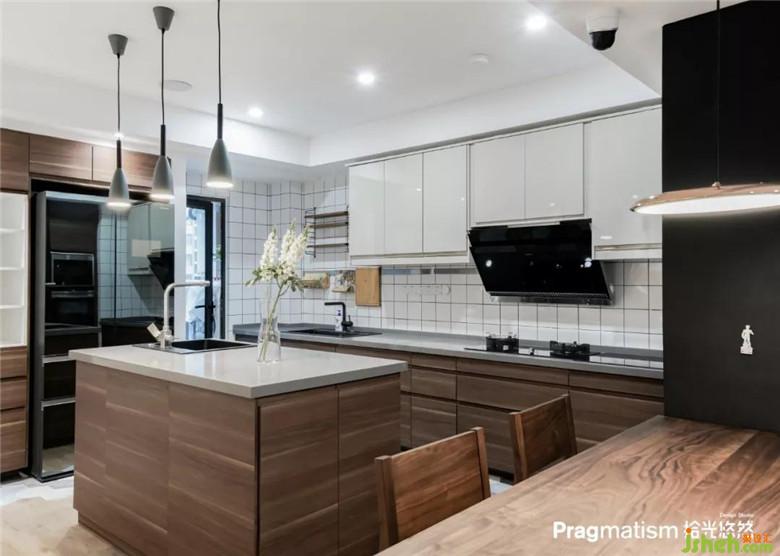 將原有的廚房砸掉以后與原有的餐廳結合,做成櫥柜+高柜+島臺+餐廳的方式,采用回字形動線??梢宰屌腼冏兂梢患腥さ氖虑?。享受與家人一起分享美食的樂趣。