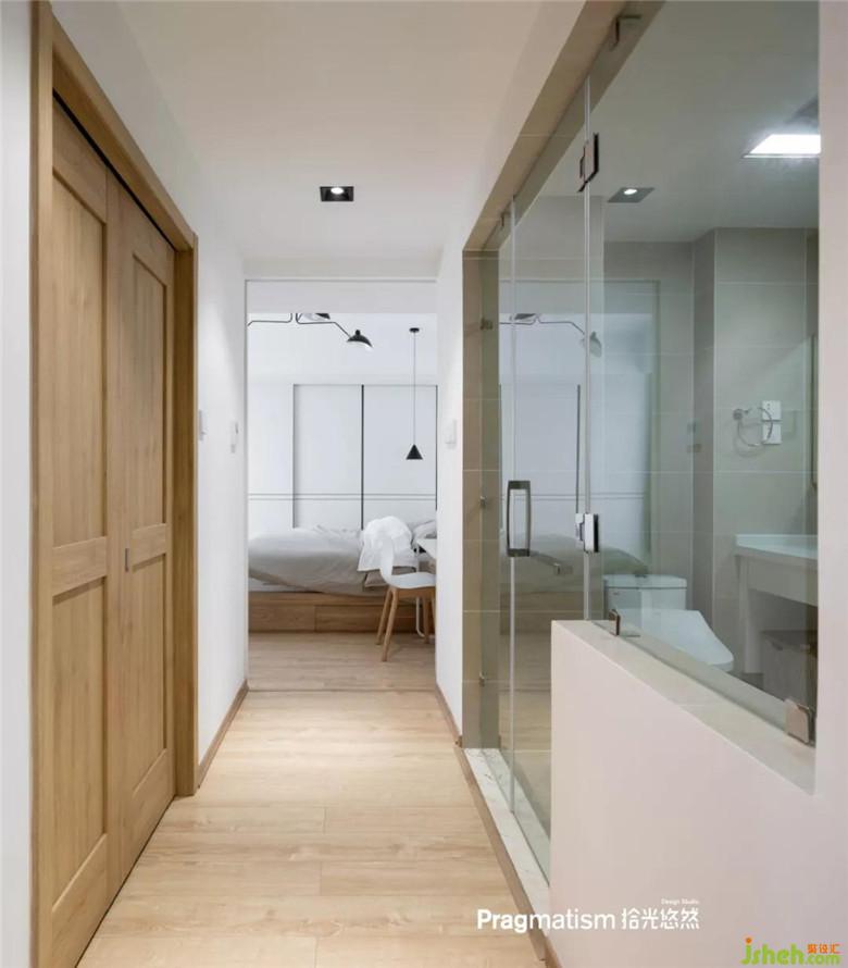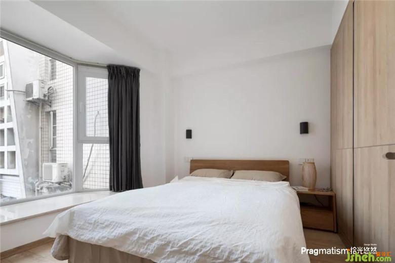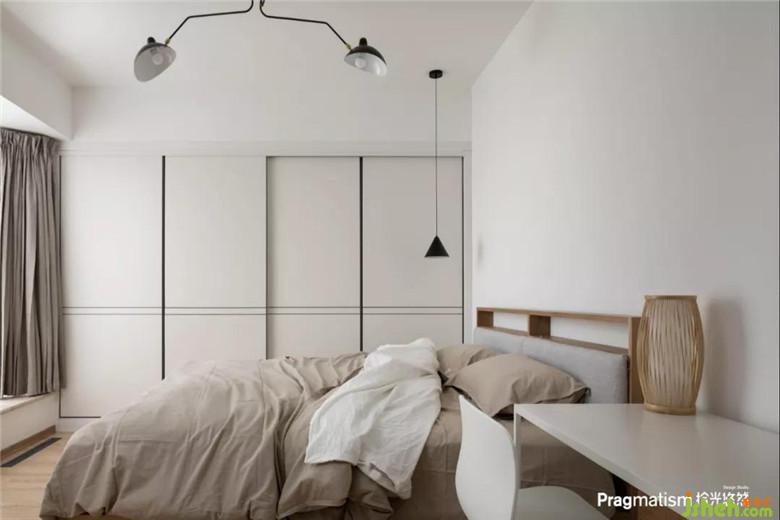 原本二樓是三間布局不合理的臥室改造以后,變成一個(gè)包含衣帽間、書房和主衛(wèi)的超級(jí)主臥。臥室簡(jiǎn)單素雅,用重色小小點(diǎn)綴,燈的顏色和材質(zhì)豐富了空間觀感。
