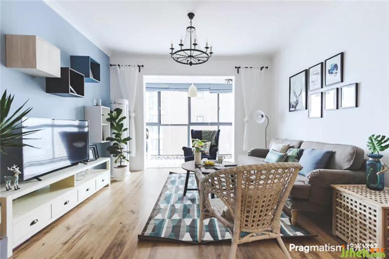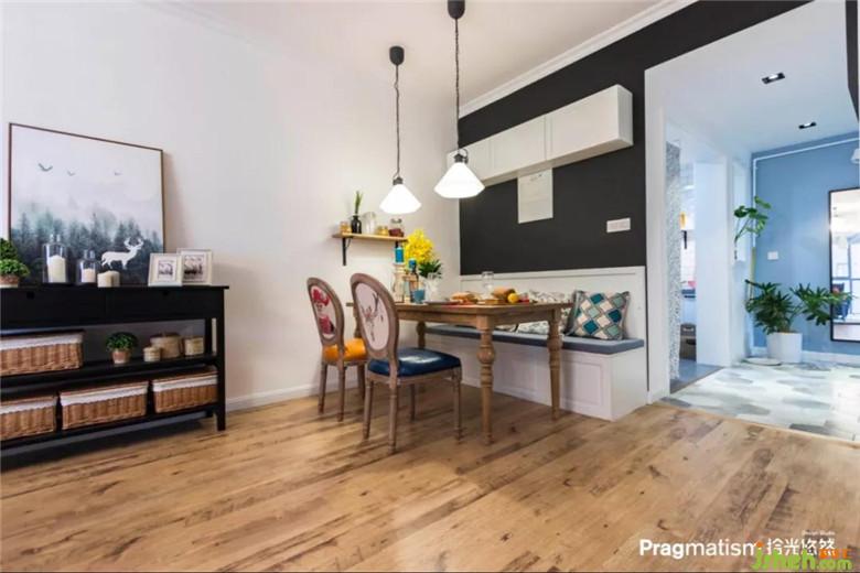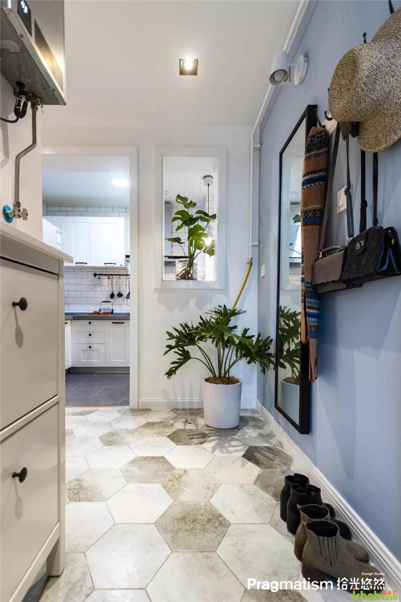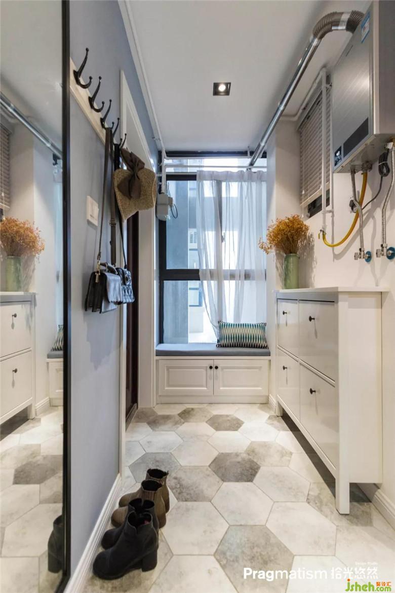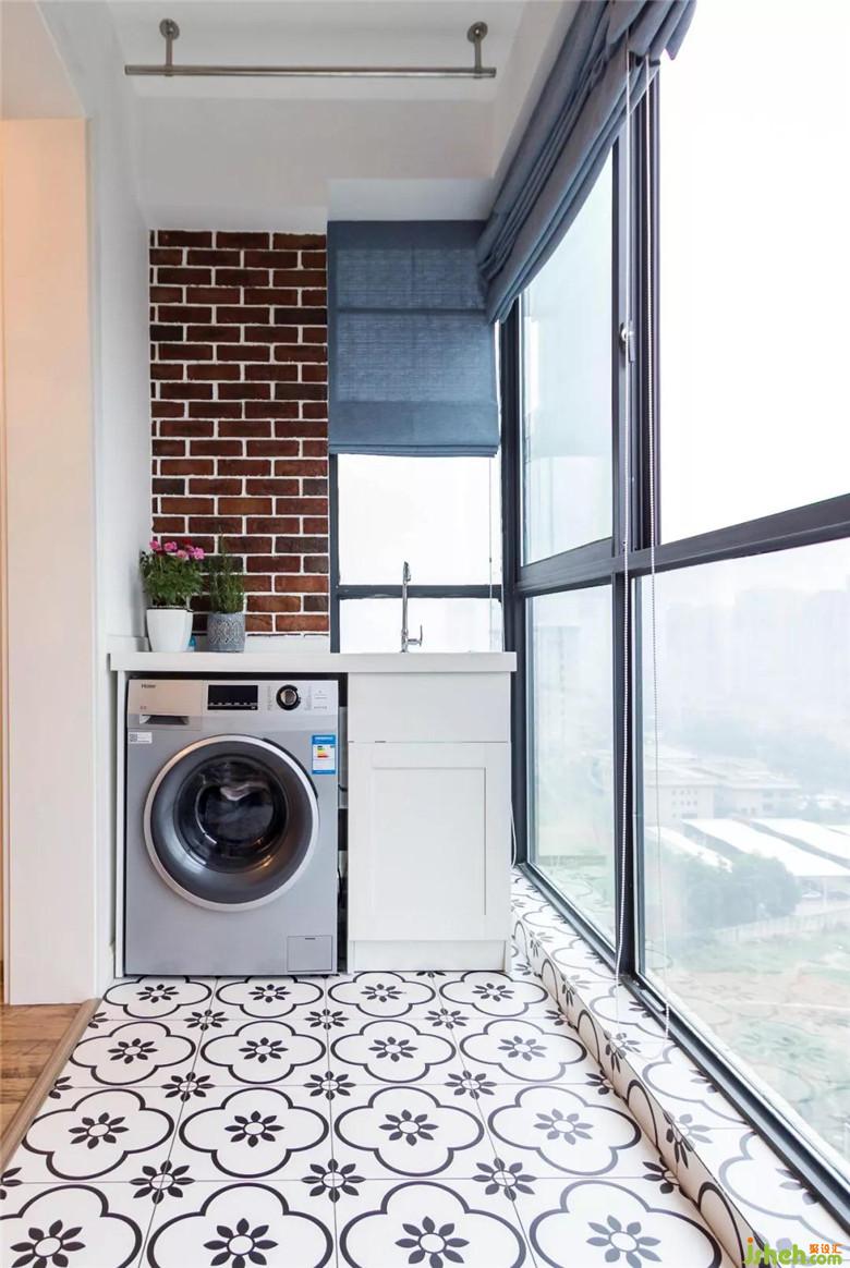 沒(méi)有生活陽(yáng)臺(tái),于是決定將休閑陽(yáng)臺(tái)利用起來(lái)。水池和洗衣機(jī)的位置都恰到好處,灰藍(lán)色的床簾及紅色的磚墻,悄悄地將客廳和陽(yáng)臺(tái)融為一體