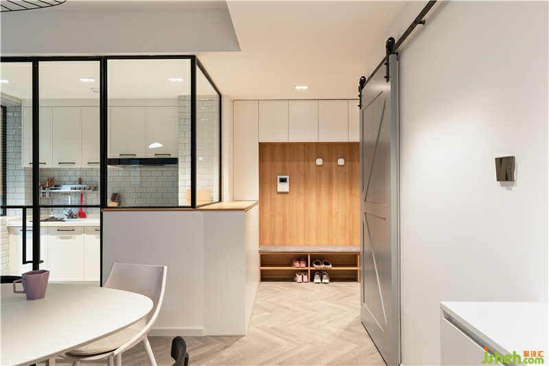 解決方式 2. 從空間上把廚房的實體墻改為鐵藝玻璃墻體,從而解決了進(jìn)門玄關(guān)較壓抑的問題。