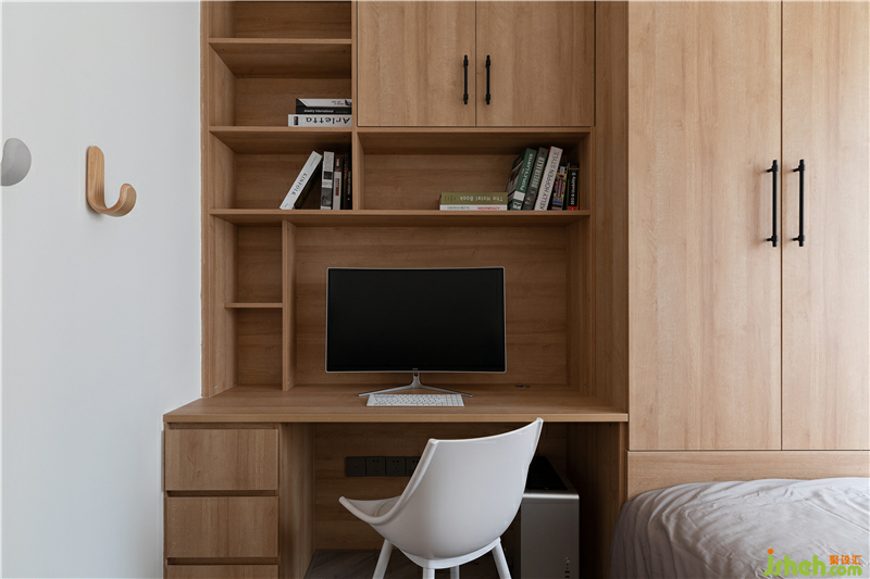 從改造上,采用榻榻米的形式壓縮空間,增加衣物空間的收納,作為偶爾留宿使用。書(shū)桌和書(shū)柜提供了業(yè)主一個(gè)隱私的工作與休閑的場(chǎng)所。