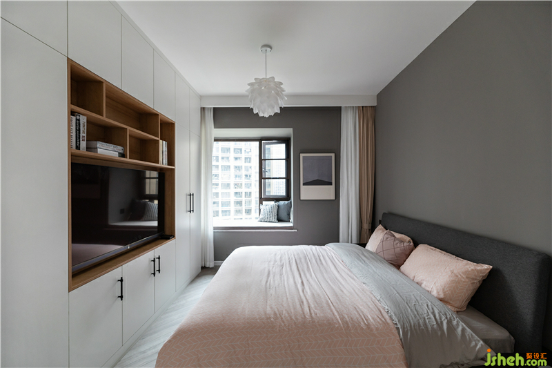 主臥主要是業(yè)主父母居住,一是有較大的儲(chǔ)物收納需求,二是需要一個(gè)單獨(dú)看電視娛樂(lè)的空間需求。