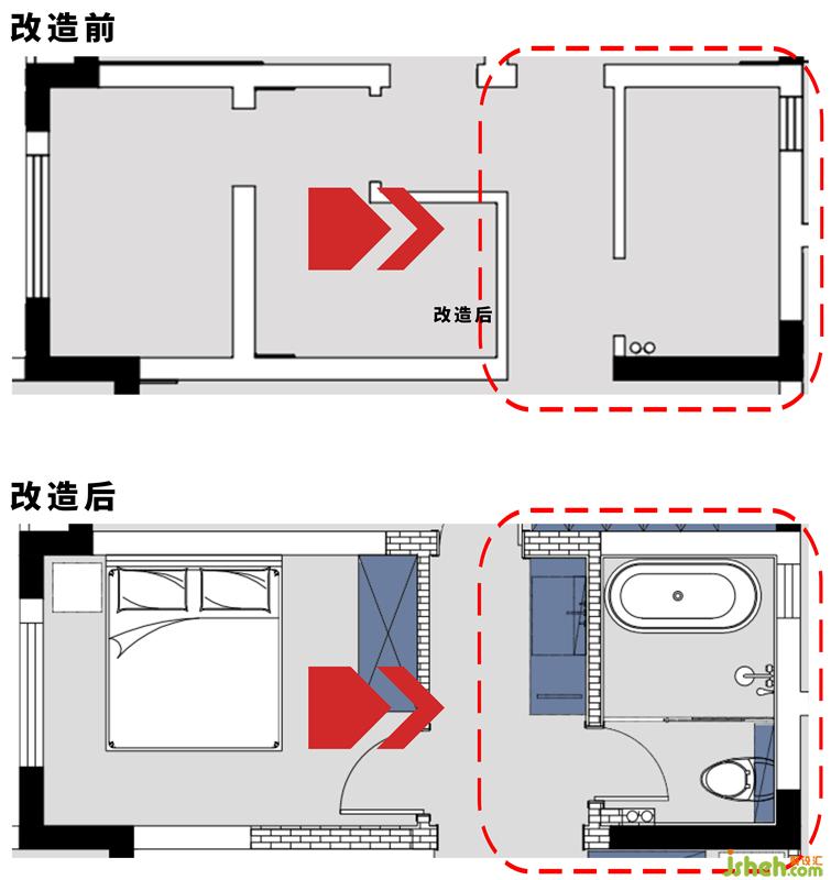 原來的衛(wèi)生間較小,舒適度不夠。于是將墻體重建,改變過道,以及壓縮次臥,擴寬衛(wèi)生間內(nèi)部空間。
