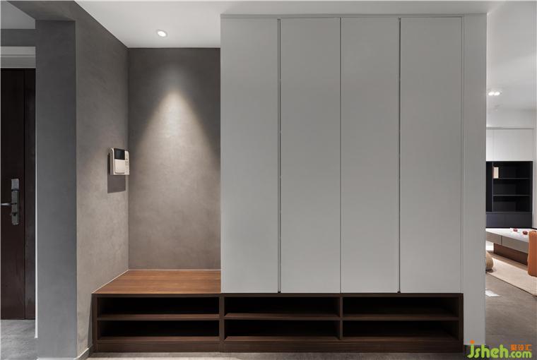 業(yè)主喜歡坐著換鞋,而且喜歡不用打開柜門就能拿到鞋。所以鞋柜下面的部分考慮鏤空的形式,方便放當(dāng)季的鞋子。柜子左邊的換鞋區(qū)的位置考慮和鞋柜一體,增強(qiáng)整體性。
