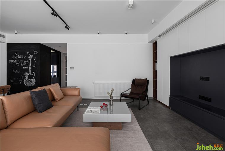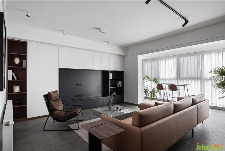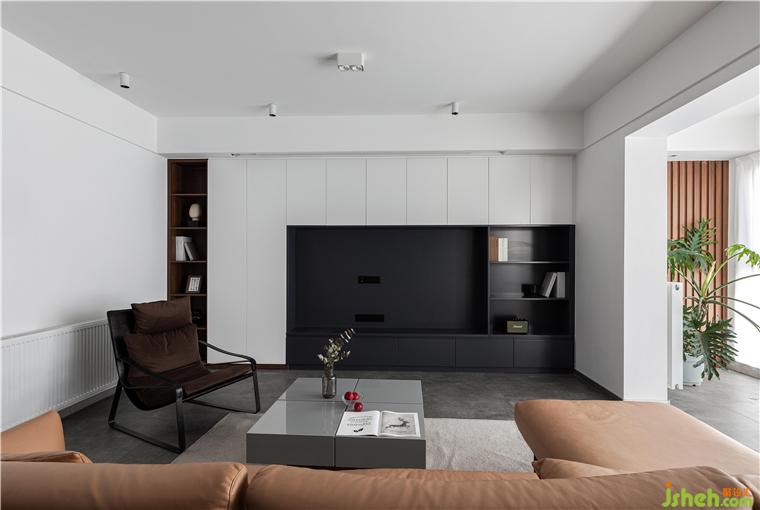 客廳因?yàn)橛写罅康臅?,零食,以及其他雜物的儲(chǔ)物需求,所以客廳的整面墻考慮了儲(chǔ)物柜的設(shè)計(jì)。