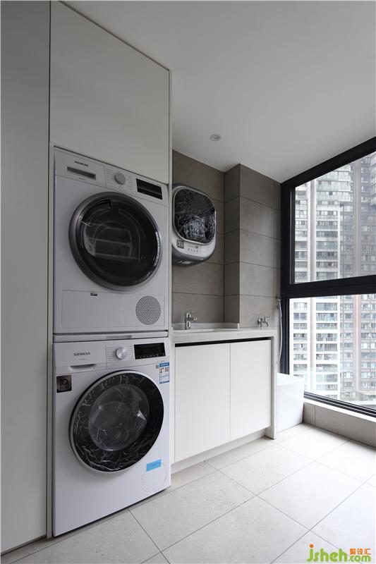 與玄關(guān)相連接的生活陽(yáng)臺(tái),改造后空間比原有面積增加了近兩倍。這里包含了洗衣機(jī)、烘干機(jī)、壁掛式洗衣機(jī)、拖布池、雜物柜一應(yīng)俱全,通過(guò)合理的布局處理,讓陽(yáng)臺(tái)變得整潔干凈且實(shí)用。